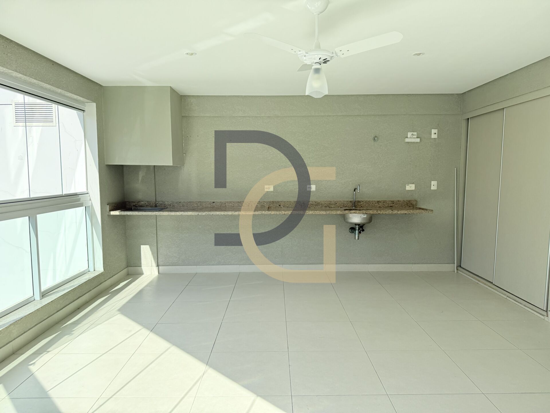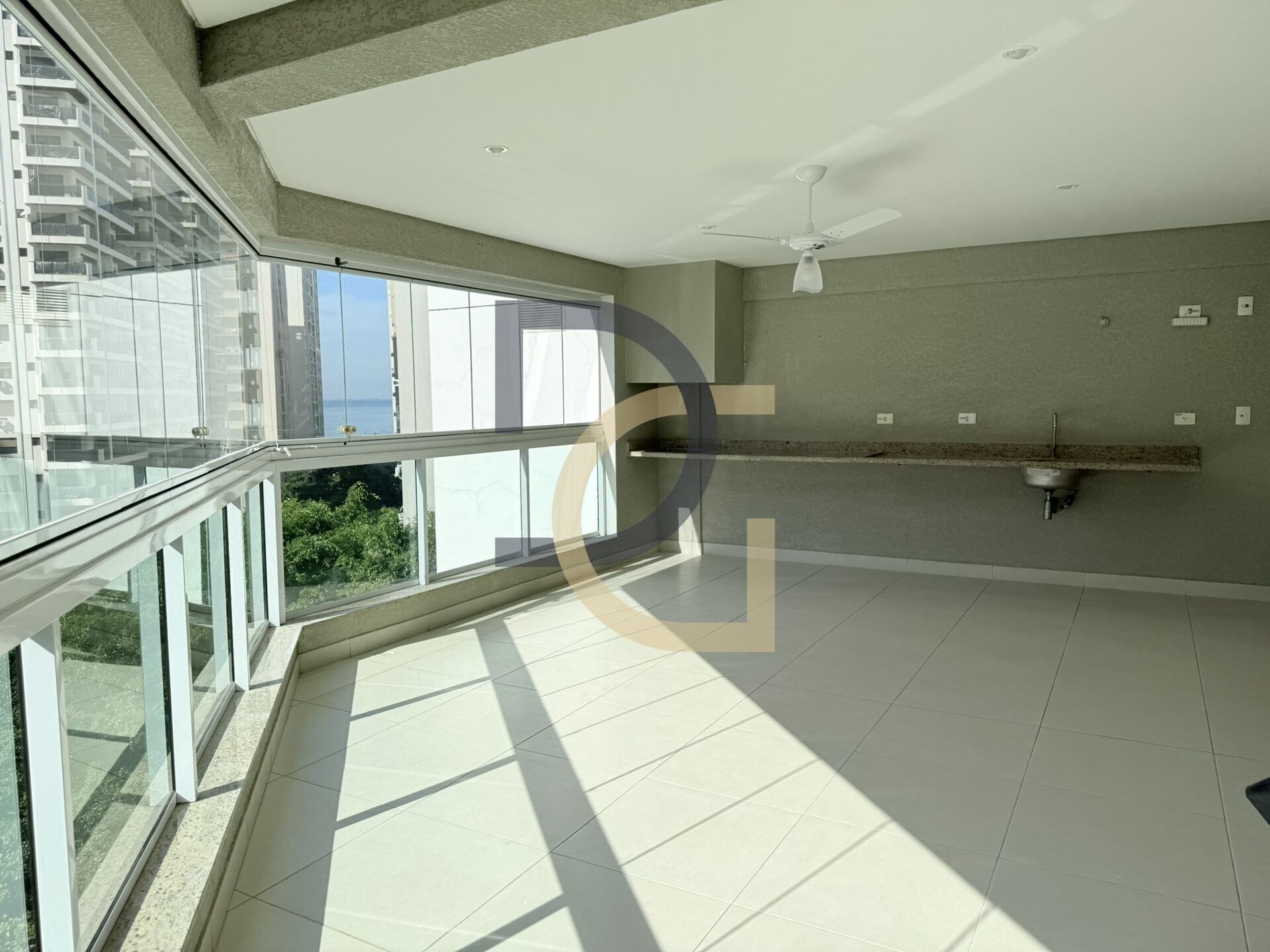 Varanda gourmet com churrasqueira e fechamento em vidro;